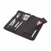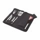 This 5-piece stainless steel BBQ set includes a fork, spatula, tongs, grill cleaner, and a black polyester apron with a pocket. All are neatly stored in a durable 600D black polypropylene zippered case, ready for your next BBQ.