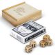 Provide hours of fun with this box of playing cards and dice. Card game set includes 52 Deck Pack of 300GSM Cards and five dice. Wood is a natural material which produces unavoidable variances in the grain pattern, colour and branding. It laser engraves to a natural etch.