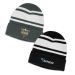 Warm knitted acrylic beanie with a roll up cuff and a striped design. It is available in one size which will fit most people.