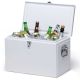 Iron sheet outer with powder coated gloss finish|Food grade PP plastic leak-proof insulated liner|Shiny chrome details|Retains ice for up to 48 Hours|Riveted industrial side carry handles|Double metal barrel hinged lid|Metal latched front closure|Capacity: 20 Litres