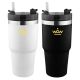 Large 600ml double wall stainless steel vacuum insulated tumbler with plastic screw on leak proof sealed lid and plastic clear straw. The lid has a splashproof turning closure. Fits most car cup holders and can be laser engraved to a shiny steel finish. The tumbler is BPA-free and is and not dishwasher safe handwashing is recommended.
