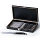 6-pcs Ergonomically designed Stainless steel knife set|6-pcs Ergonomically designed knife set|4.3 serrated knives - 1.5mm thickness|Black ABS plastic handles|Displayed in a bespoke double hinged po di fame black beech wood presentation box with metal closure