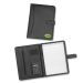 Large luxury PU portfolio with a calculator, a lined A4 pad, a pen loop, pockets for business cards and a secure closure strap. It laser engraves to a matt brown finish.