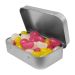 50 grams assorted or corporate colour mini Jelly Beans packed in a silver metal tin. A variety of 9 complementary tastes for a true flavour explosion with every bite. Jelly Bean is a very popular promotional product for advertising and corporate marketing events it is also a great gift for weddings parties and personal gifts. This mini Jelly Bean tin box is mixed with 9 great colours and Flavors - White (Lychee) Yellow (Lemon) Orange (Orange) Red (Strawberry) Purple (Grape) Pink (Raspberry) Green (Apple) Blue (Blueberry) Black (Liquorice).