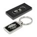 Metal key ring with an aluminium finish on one side which laser engraves to an oxidised white colour. The reverse side has a plated shiny chrome finish which engraves to a natural etch. It is nicely presented in a black gift box.