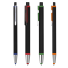 Click action metal ball pen, black rubberized aluminum barrel, matt metallic sprayed rings, solid black push button, metal clip, chrome plated tip, X-20 ball pen refill. Touch screen stylus. German Dokumental ink, T/C nib. Extended writing length.