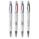 Twist-action plastic pen designed for convenience, featuring an easy slip-over clip for secure attachment to pockets or notebooks. The sleek white barrel is complemented by a coloured insert for a stylish touch.